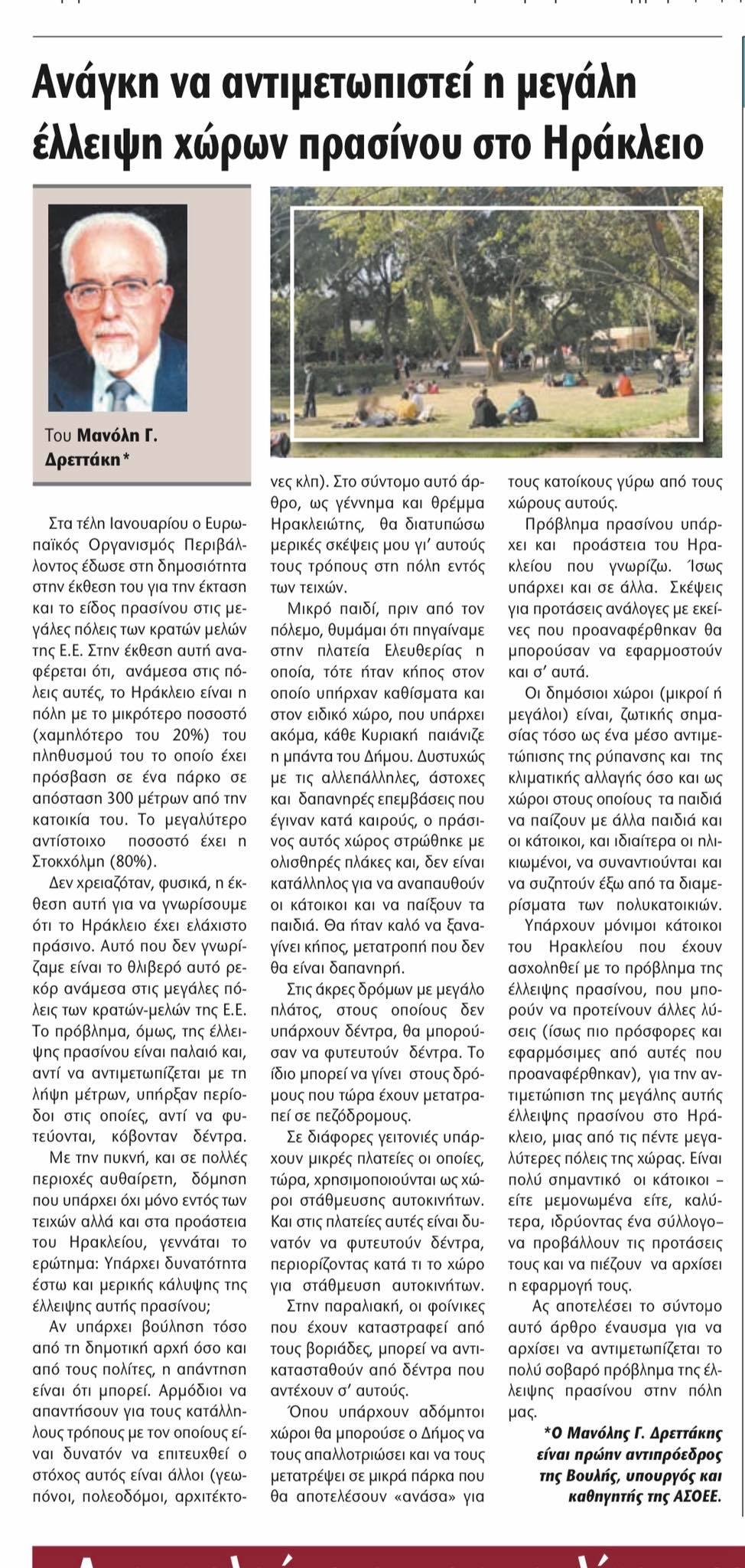 Ανάγκη να αντιμετωπιστεί η μεγάλη έλλειψη χώρων πρασίνου στο Ηράκλειο
