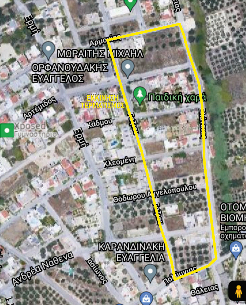 οδός Σαμαράκη- Γαζίου (γραφεία Πολιτιστικού Συλλόγου)-αριστερά οδός Πολύμνιας- οδός Ελάτειας-αριστερά οδός Αρμονίας –αριστερά οδός Σαμαράκη-Τερματισμός οδός Γαζίου.