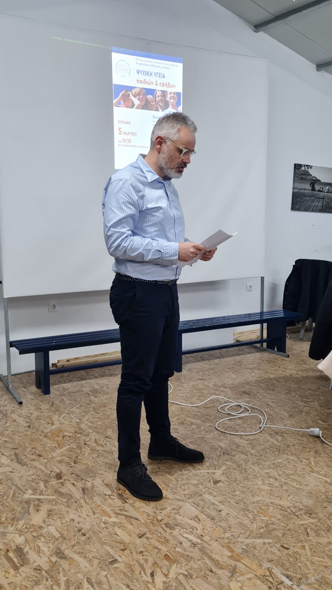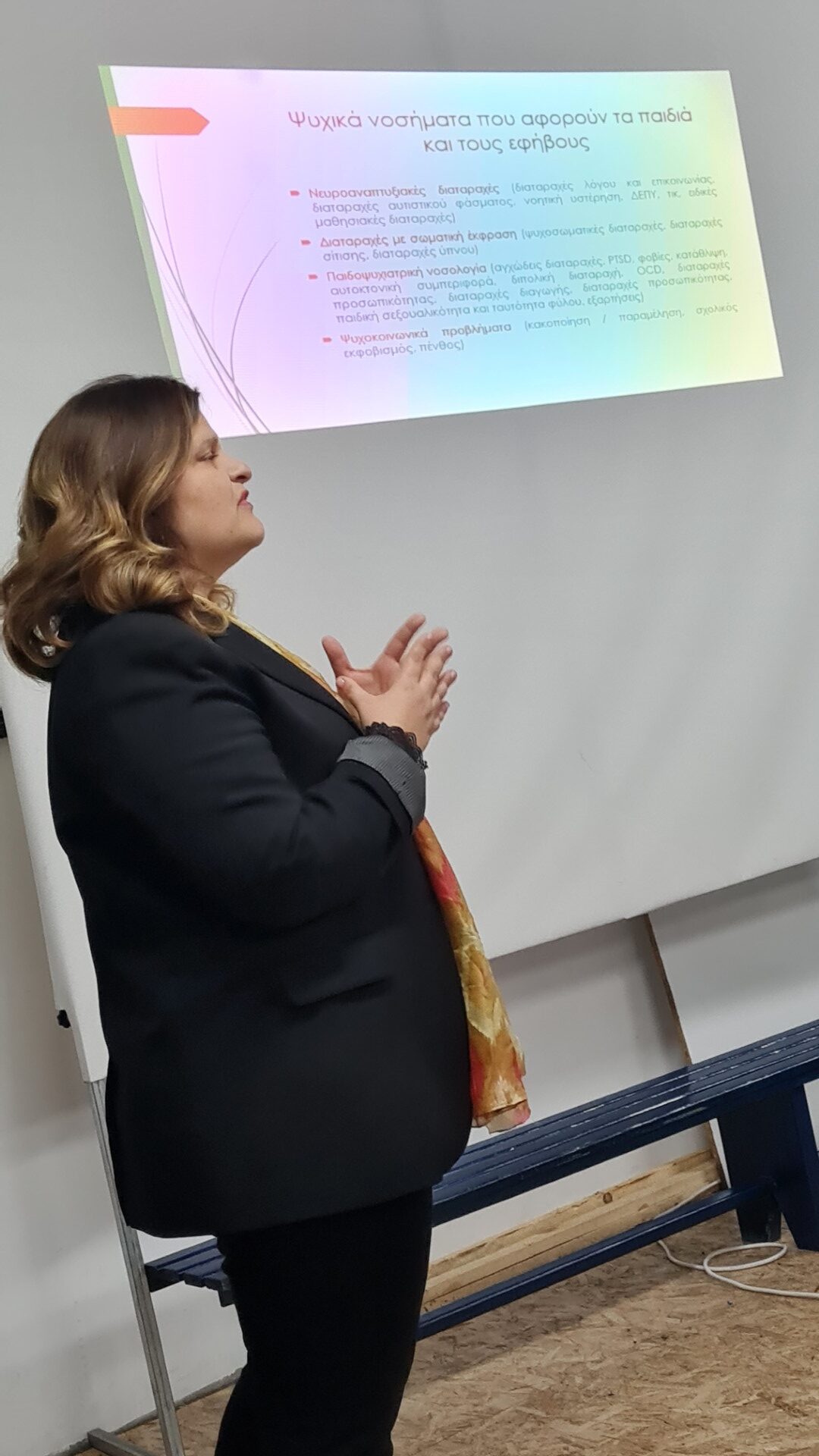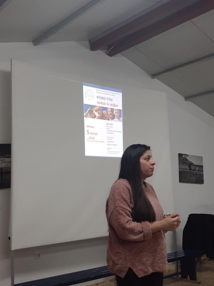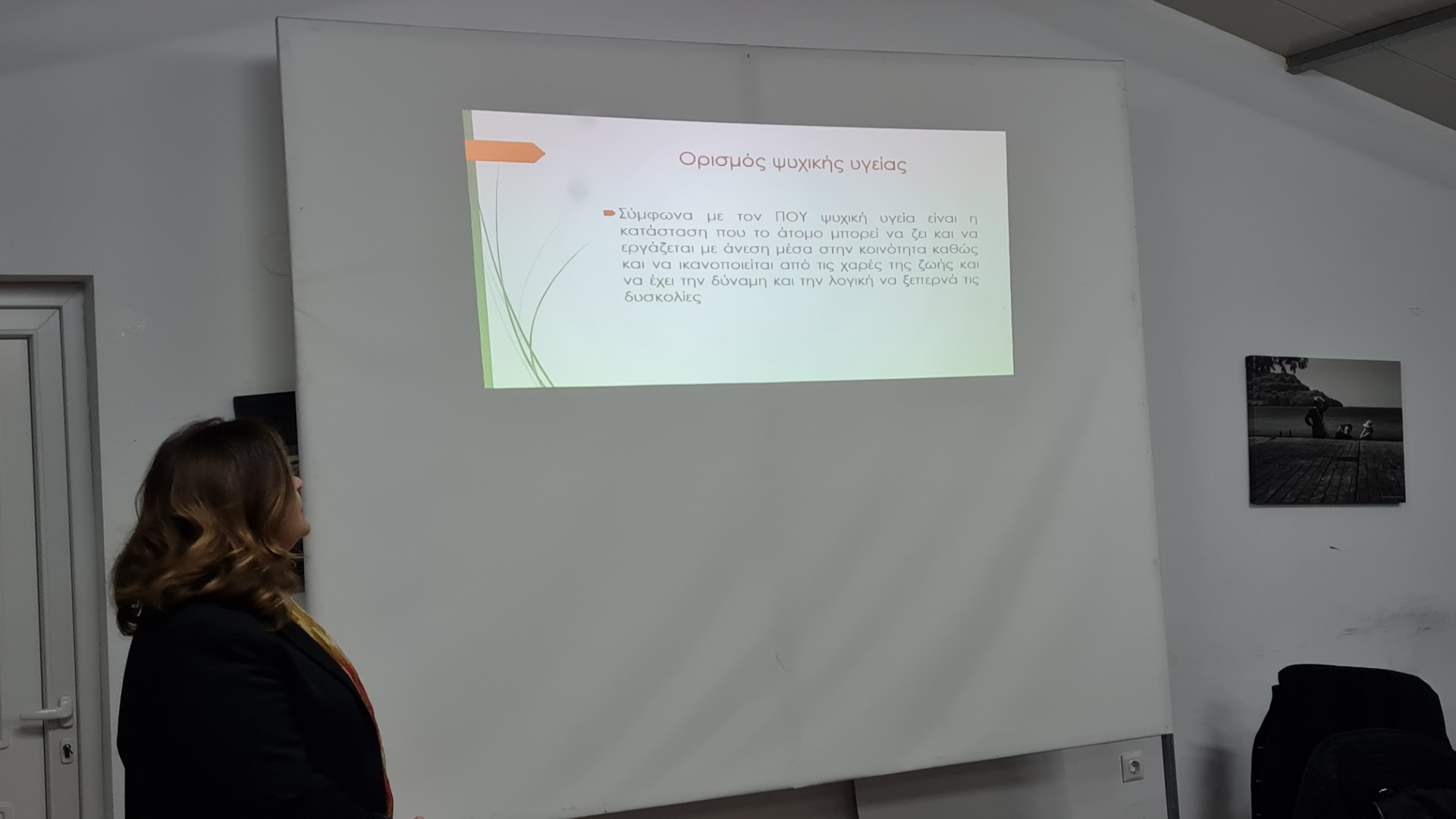 Ευχαριστούμε την Μαρία Αναστασάκη (ψυχίατρο) που με την ομιλία της μας εισήγαγε στις έννοιες γύρω από τα ψυχικά νοσήματα, τις εξαρτήσεις κά, τα πολύ ενδιαφέροντα στατιστικά που δείχνουν τις αυξημένες κοινωνικές ανάγκες σε ειδικούς λειτουργούς της ψυχικής υγείας, με μια σειρά ειδικοτήτων για την ολόπλευρη στήριξη του ατόμου.